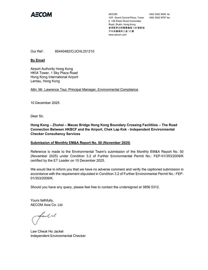 On the other hand, the 3RS EIA had subsequently commenced and completed (EIA Register No.: AEIAR-185/2014) by AAHK, and it has already taken the layout of the proposed HKIA-HKBCF Road Connection into account and has assessed the relevant cumulative environmental impacts. The planned change in implementation agent from HyD to AAHK for the construction of the proposed HKIA-HKBCF Road Connection outside the Airport Island would, involves a transfer of corresponding responsibilities under the HKBCF EP from HyD to AAHK. To this end, an Environmental Review Report (ERR) was prepared and submitted to Environmental Protection Department (EPD) in November 2018 which concluded that the change of implementation agent from HyD to AAHK for the construction of HKIA-HKBCF Road Connection would not result in any exceedance or violation of the environmental performance requirements set out in the approved HKBCF and 3RS EIAs and the mitigation measures identified in these EIAs remained relevant and valid. A Further Environmental Permit (EP No. FEP-01/353/2009/K) for the construction of the HKIA-HKBCF Road Connection (hereinafter referred to as “the Project”) was granted to AAHK in December 2018 in accordance with Section 12 of EIAO. Afterwards, an Environmental Monitoring and Audit Manual for HZMB HKBCF – The Road Connection between HKBCF and the Airport, Chek Lap Kok (the EM&A Manual) has been prepared to include appropriate environmental monitoring and audit (EM&A) requirements in accordance with the information and recommendations described in the EIA Report and by taking into account the specific site conditions of the Project under the FEP.